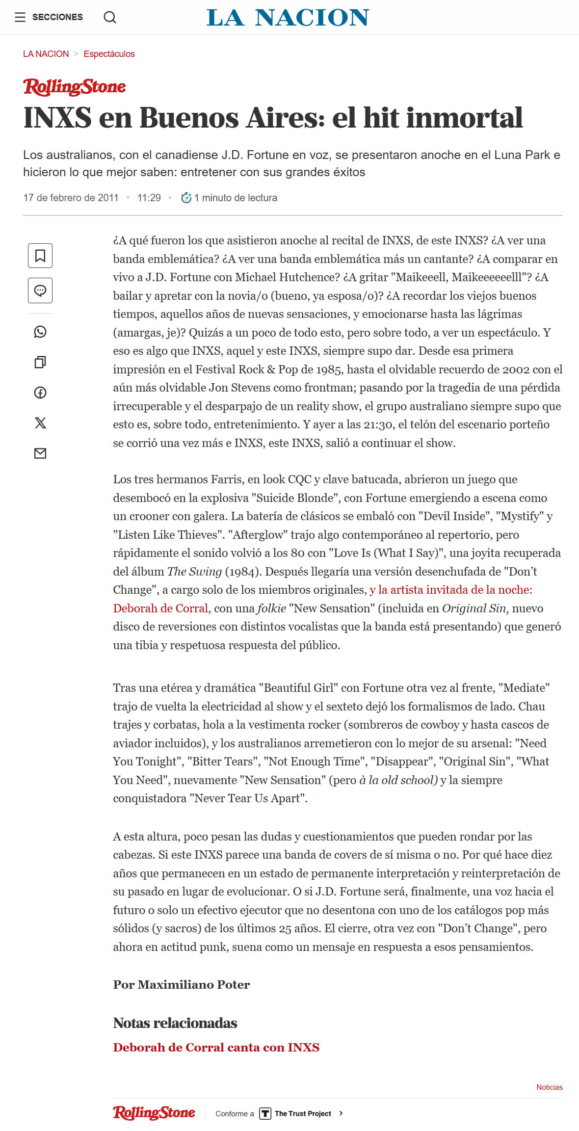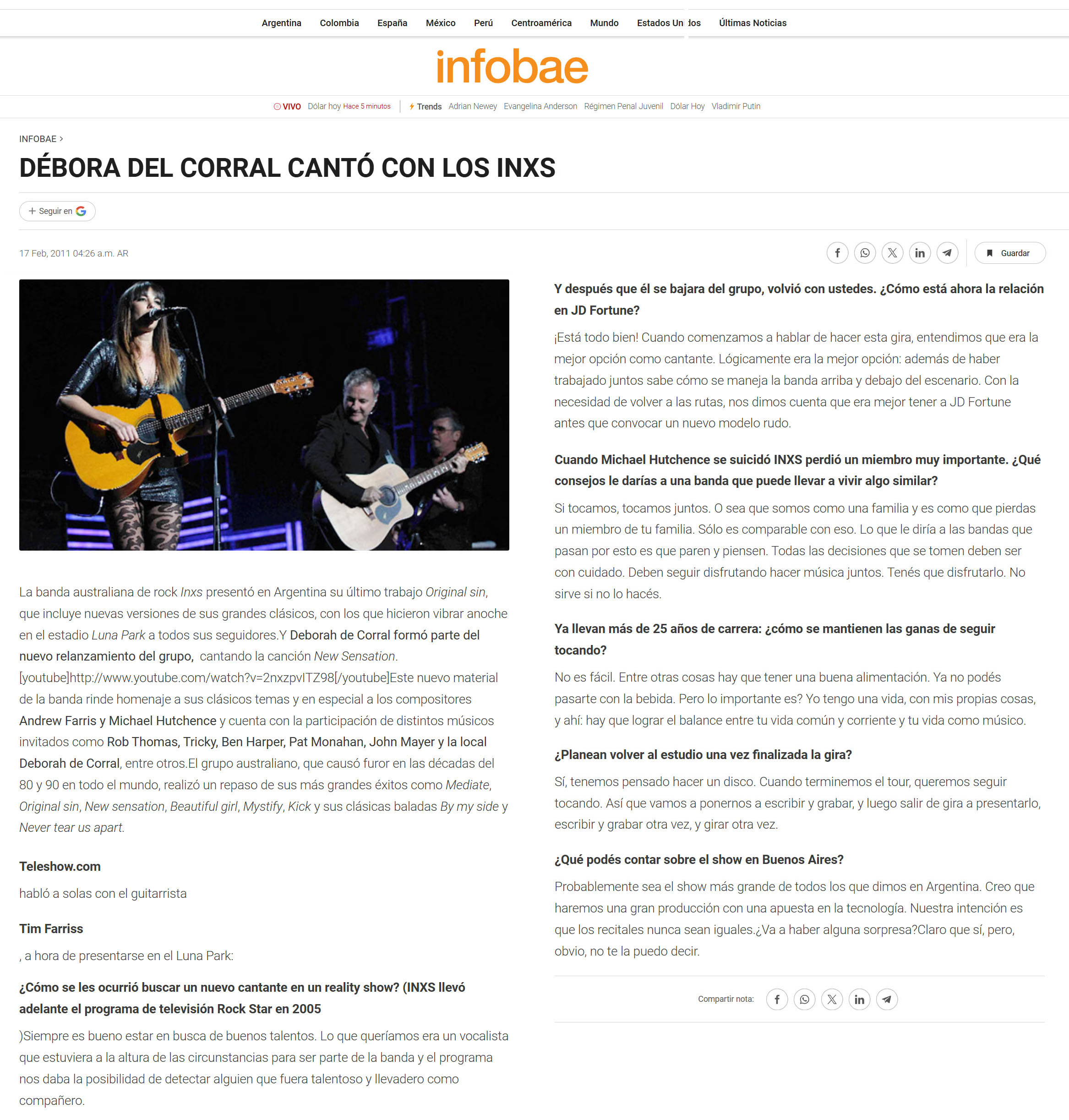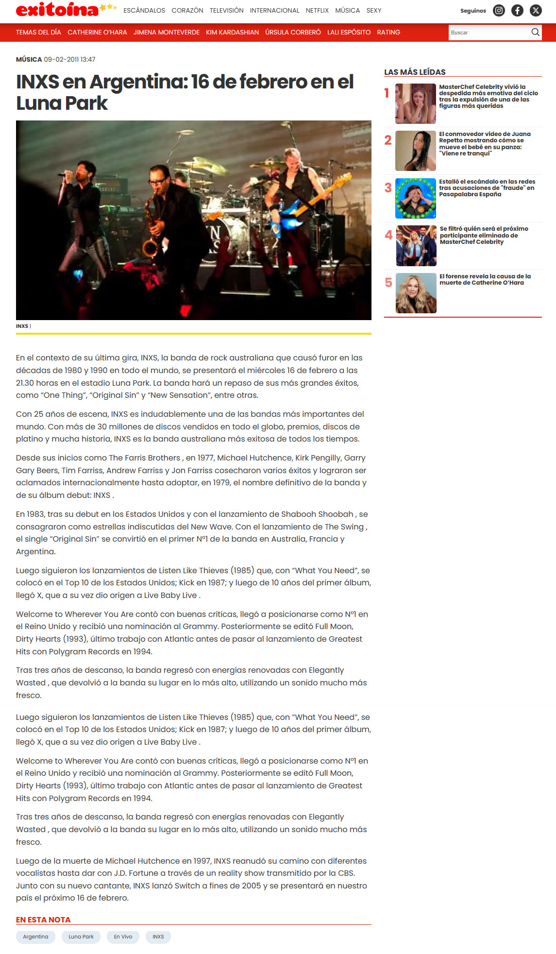 La agrupación australiana INXS se presentó el miércoles 16 de febrero en el Luna Park, en un show que marcó un momento especial para los fanáticos locales. Fue la primera visita de la banda al país junto a su nuevo vocalista, J.D. Fortune, quien asumió el desafío de ocupar el lugar dejado por el inolvidable Michael Hutchence.