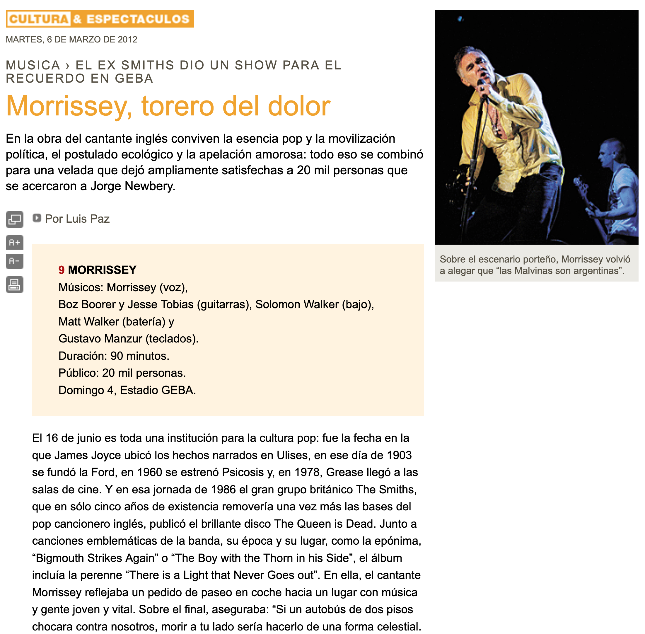 El show de Morrissey el 4 de marzo de 2012 en el estadio GEBA fue el cierre de su gira por Argentina, marcada por un magnetismo único y declaraciones polémicas sobre las Malvinas. El concierto es recordado por un momento de euforia cuando el público saltó las vallas para acercarse al escenario tras una invitación de sus músicos.