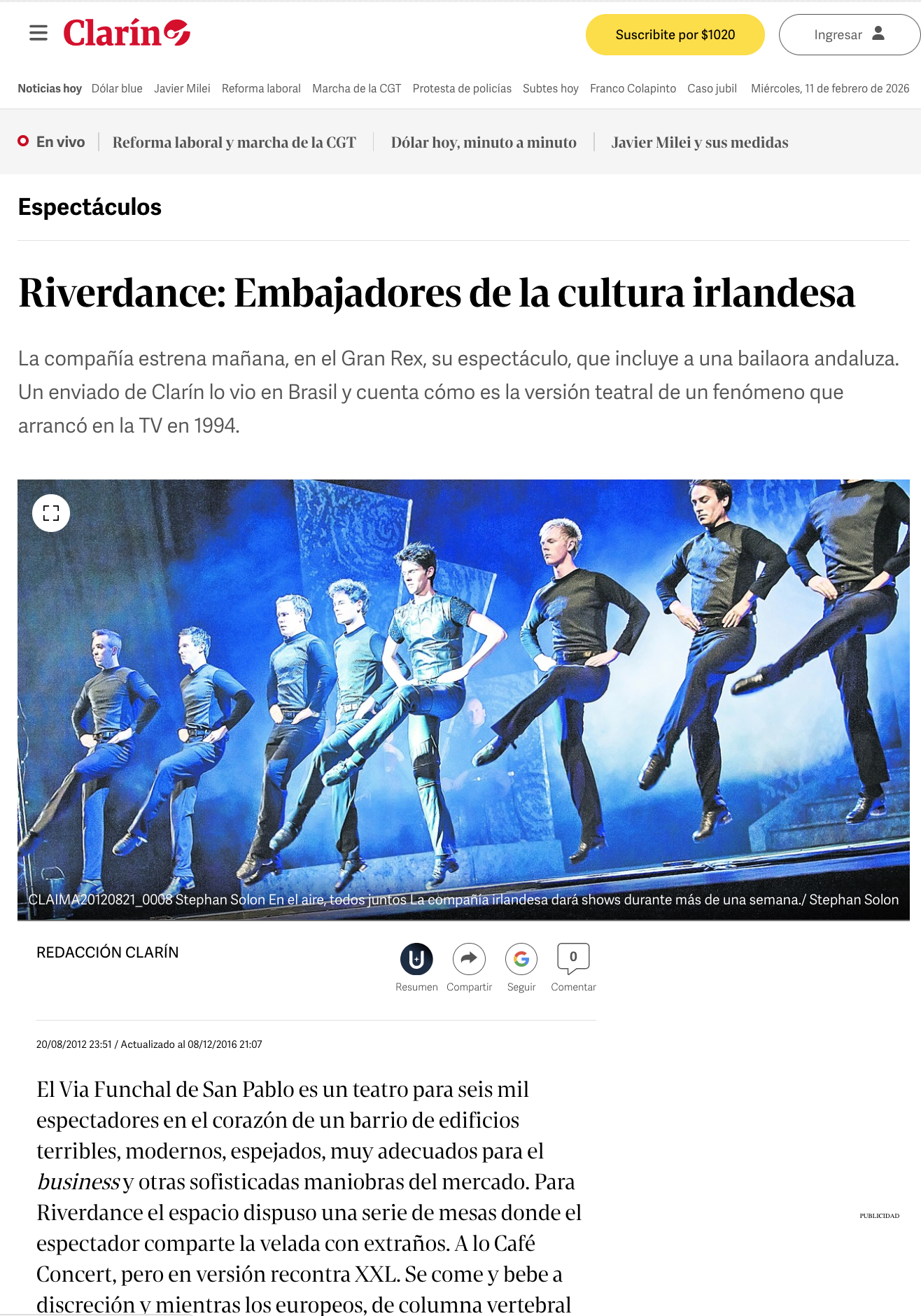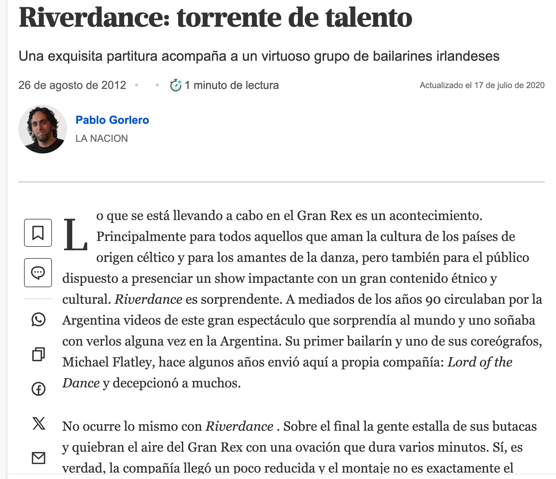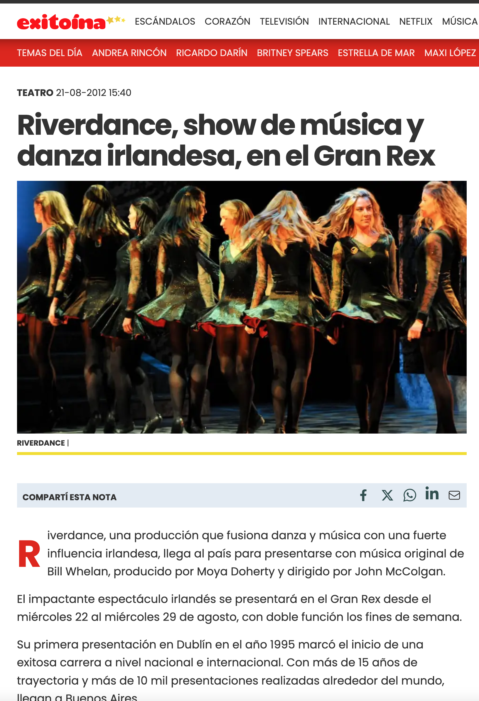 Para finales de agosto de 2012, el Teatro Gran Rex se llenó de la energía del zapateo irlandés con el regreso de Riverdance, el espectáculo de danza más famoso del mundo, tras 12 años de ausencia en Argentina.